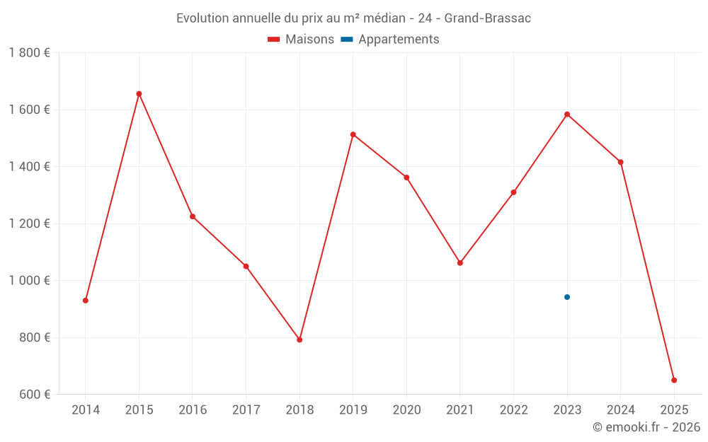 Le prix médian sur les 14 transactions de maisons des 24 derniers mois dans la commune de Grand-Brassac était de 1 584 € par mètre carré pour une valeur foncière médiane de 160 500 €. Sur cette période 60% des transactions se sont situées entre 934 et 1 869 € par mètre carré (du 2ème au 8ème déciles).