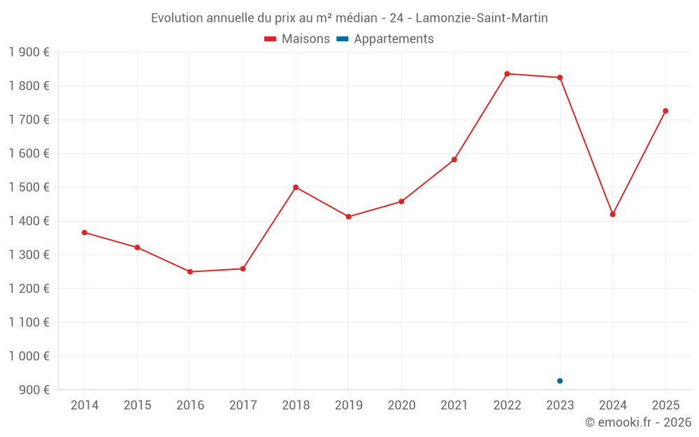 Le prix médian sur les 20 transactions de maisons des 12 derniers mois dans la commune de Lamonzie-Saint-Martin était de 1 580 € par mètre carré pour une valeur foncière médiane de 148 600 €. Sur cette période 60% des transactions se sont situées entre 1 054 et 2 117 € par mètre carré (du 2ème au 8ème déciles).