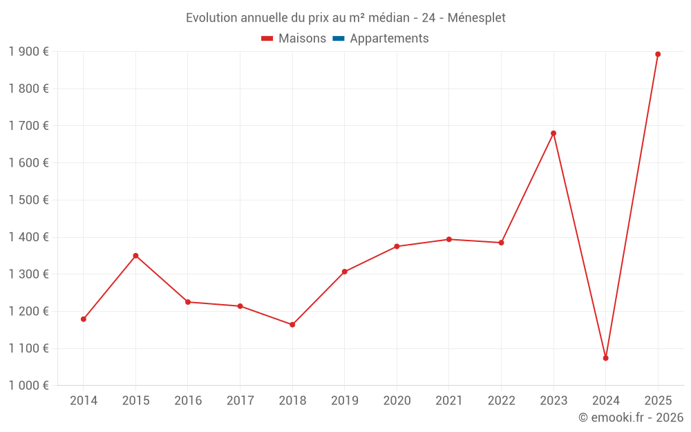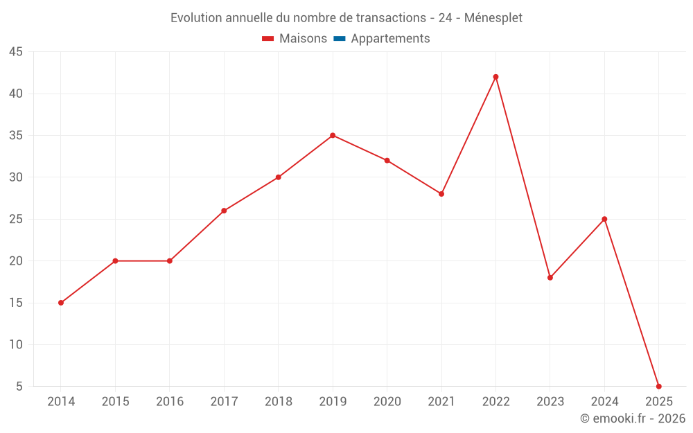 Le prix médian sur les 22 transactions de maisons des 12 derniers mois dans la commune de Ménesplet était de 1 318 € par mètre carré pour une valeur foncière médiane de 151 000 €. Sur cette période 60% des transactions se sont situées entre 957 et 1 766 € par mètre carré (du 2ème au 8ème déciles).