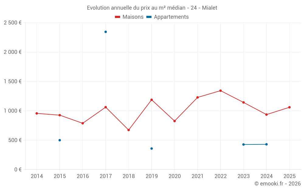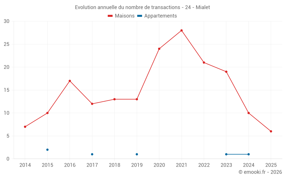 Le prix médian sur les 23 transactions de maisons des 24 derniers mois dans la commune de Mialet était de 1 075 € par mètre carré pour une valeur foncière médiane de 107 000 €. Sur cette période 60% des transactions se sont situées entre 813 et 1 496 € par mètre carré (du 2ème au 8ème déciles).