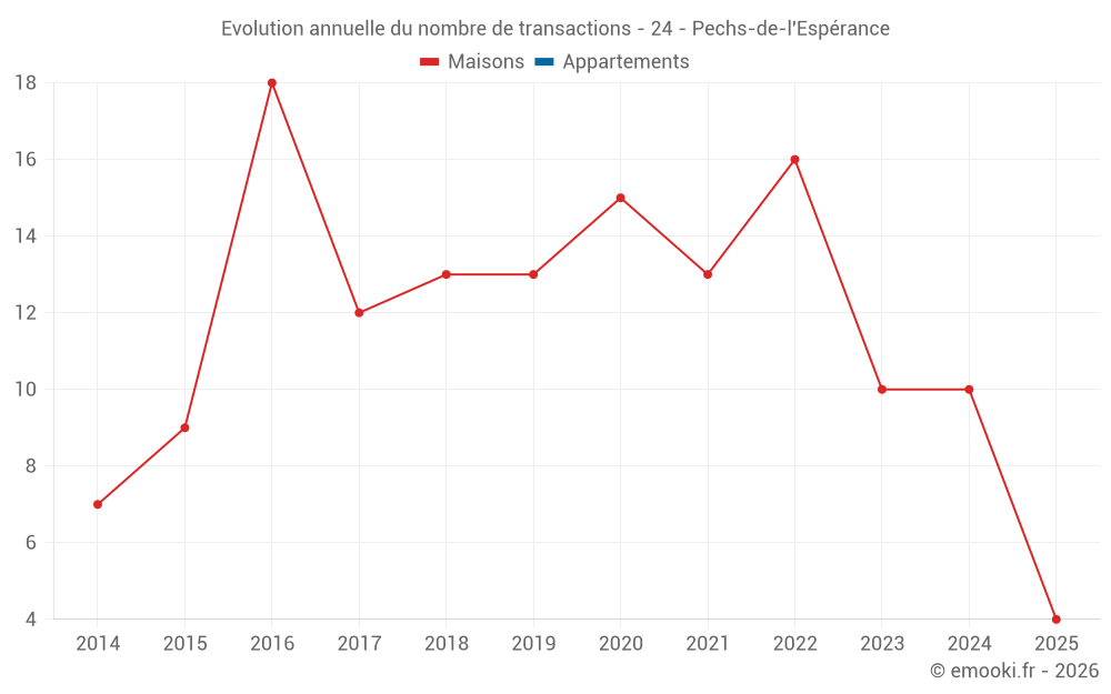 Le prix médian sur les 17 transactions de maisons des 24 derniers mois dans la commune de Pechs-de-l'Espérance était de 1 781 € par mètre carré pour une valeur foncière médiane de 143 750 €. Sur cette période 60% des transactions se sont situées entre 1 046 et 2 115 € par mètre carré (du 2ème au 8ème déciles).