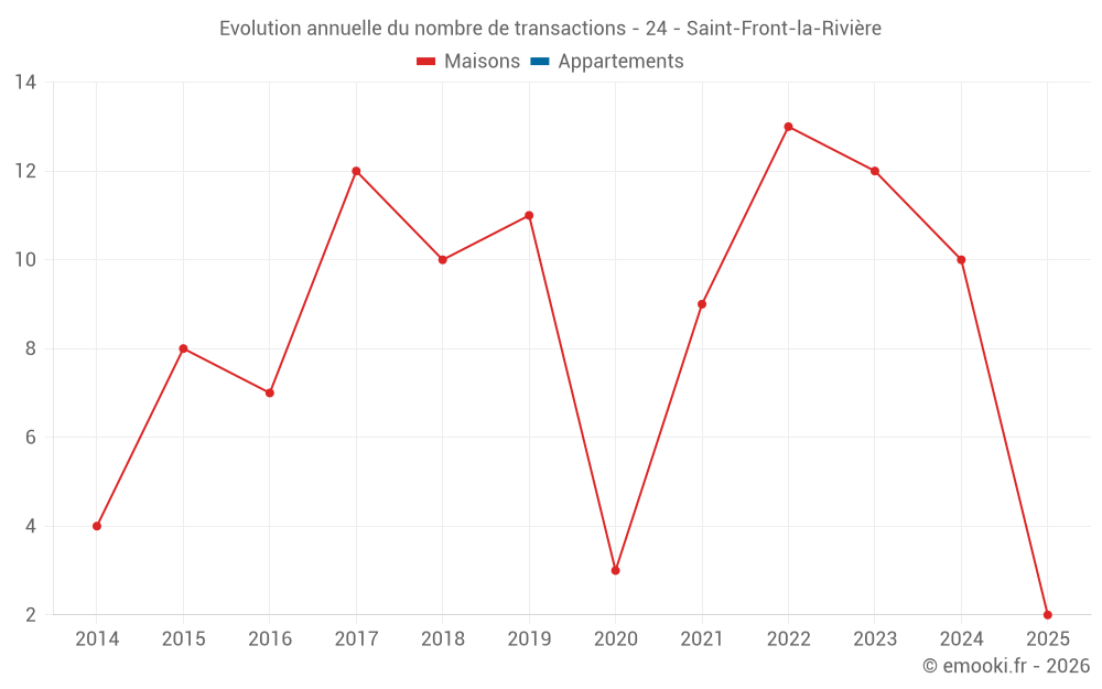 Le prix médian sur les 20 transactions de maisons des 24 derniers mois dans la commune de Saint-Front-la-Rivière était de 1 119 € par mètre carré pour une valeur foncière médiane de 110 342 €. Sur cette période 60% des transactions se sont situées entre 803 et 1 532 € par mètre carré (du 2ème au 8ème déciles).