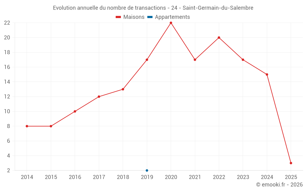 Le prix médian sur les 24 transactions de maisons des 24 derniers mois dans la commune de Saint-Germain-du-Salembre était de 1 702 € par mètre carré pour une valeur foncière médiane de 133 500 €. Sur cette période 60% des transactions se sont situées entre 1 321 et 2 066 € par mètre carré (du 2ème au 8ème déciles).