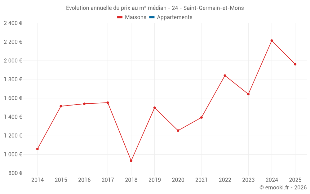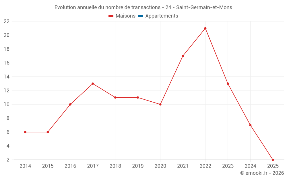 Le prix médian sur les 14 transactions de maisons des 24 derniers mois dans la commune de Saint-Germain-et-Mons était de 2 044 € par mètre carré pour une valeur foncière médiane de 230 338 €. Sur cette période 60% des transactions se sont situées entre 1 526 et 2 327 € par mètre carré (du 2ème au 8ème déciles).