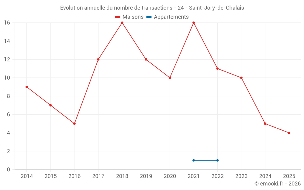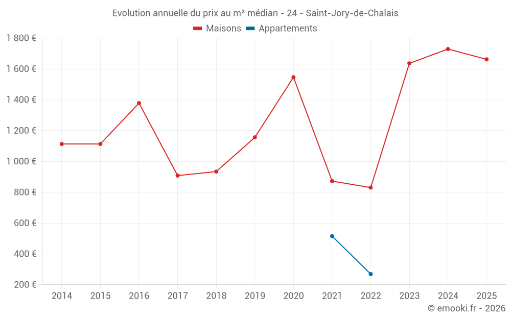 Le prix médian sur les 14 transactions de maisons des 24 derniers mois dans la commune de Saint-Jory-de-Chalais était de 1 701 € par mètre carré pour une valeur foncière médiane de 133 000 €. Sur cette période 60% des transactions se sont situées entre 890 et 2 261 € par mètre carré (du 2ème au 8ème déciles).