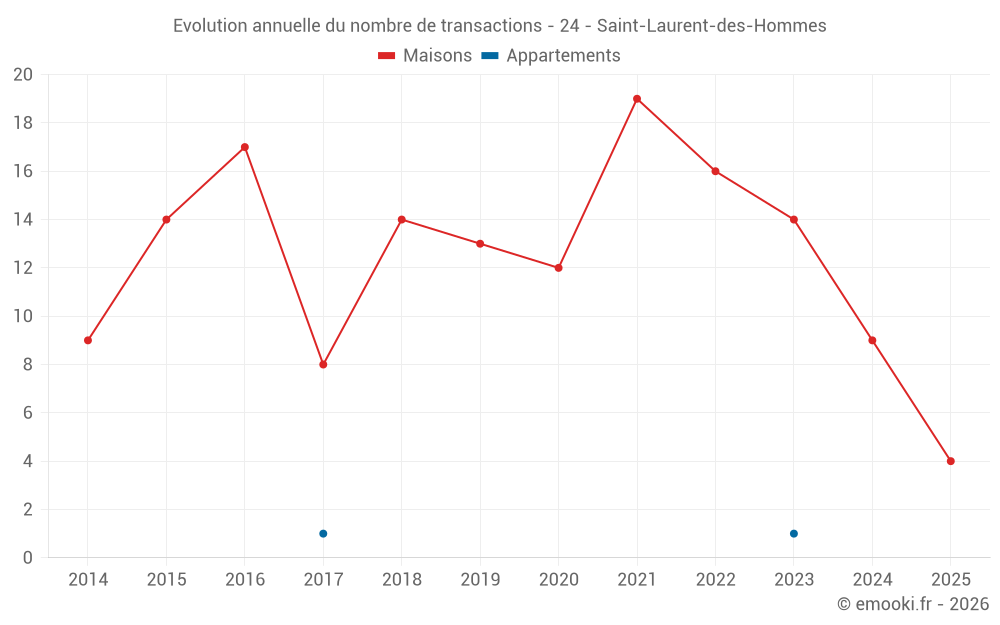 Le prix médian sur les 22 transactions de maisons des 24 derniers mois dans la commune de Saint-Laurent-des-Hommes était de 1 515 € par mètre carré pour une valeur foncière médiane de 151 670 €. Sur cette période 60% des transactions se sont situées entre 900 et 1 828 € par mètre carré (du 2ème au 8ème déciles).