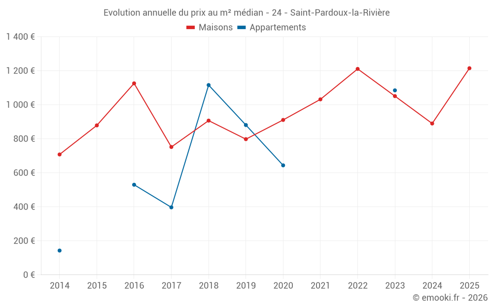 Le prix médian sur les 21 transactions de maisons des 12 derniers mois dans la commune de Saint-Pardoux-la-Rivière était de 1 165 € par mètre carré pour une valeur foncière médiane de 75 000 €. Sur cette période 60% des transactions se sont situées entre 473 et 1 648 € par mètre carré (du 2ème au 8ème déciles).