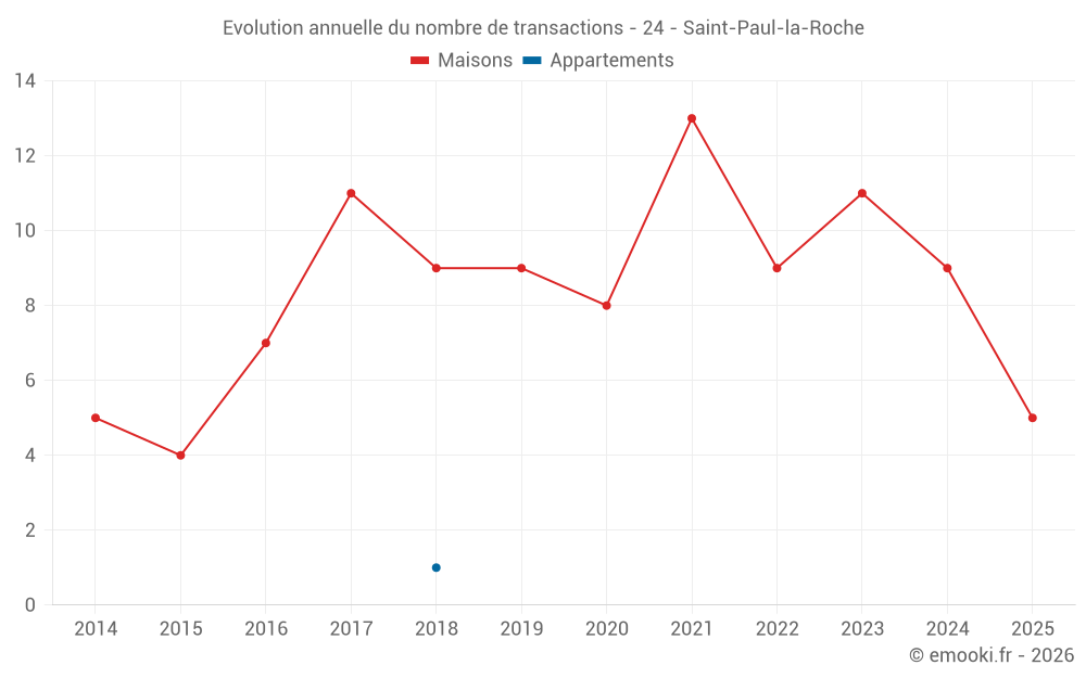 Le prix médian sur les 14 transactions de maisons des 24 derniers mois dans la commune de Saint-Paul-la-Roche était de 958 € par mètre carré pour une valeur foncière médiane de 80 000 €. Sur cette période 60% des transactions se sont situées entre 336 et 1 814 € par mètre carré (du 2ème au 8ème déciles).