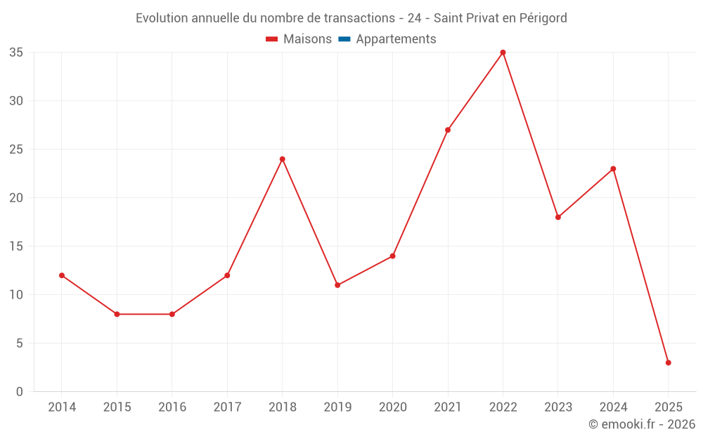 Le prix médian sur les 31 transactions de maisons des 24 derniers mois dans la commune de Saint Privat en Périgord était de 1 328 € par mètre carré pour une valeur foncière médiane de 170 000 €. Sur cette période 60% des transactions se sont situées entre 935 et 1 845 € par mètre carré (du 2ème au 8ème déciles).