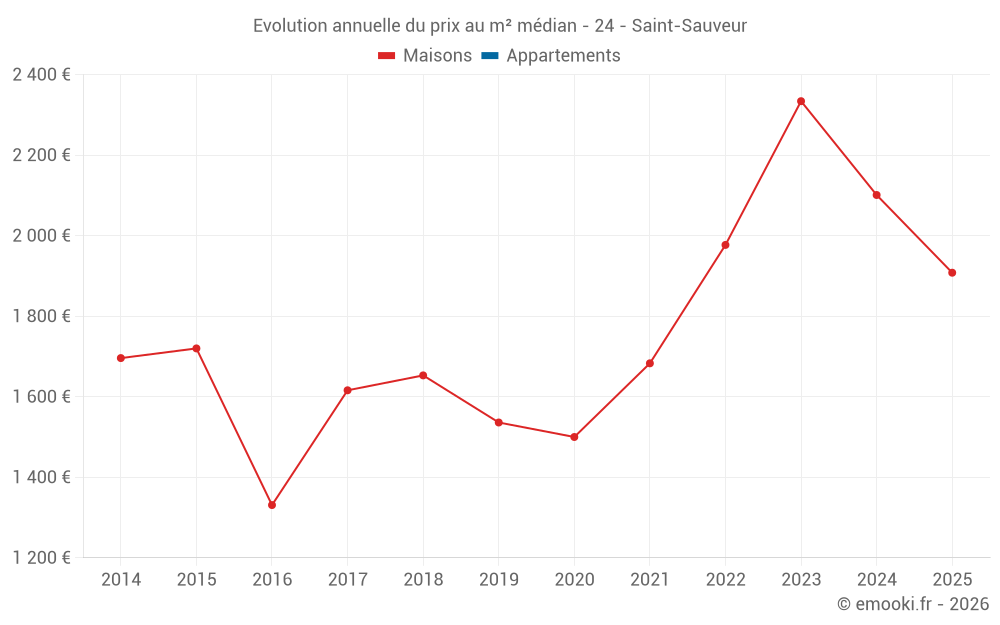 Le prix médian sur les 19 transactions de maisons des 24 derniers mois dans la commune de Saint-Sauveur était de 2 170 € par mètre carré pour une valeur foncière médiane de 208 000 €. Sur cette période 60% des transactions se sont situées entre 1 698 et 2 410 € par mètre carré (du 2ème au 8ème déciles).