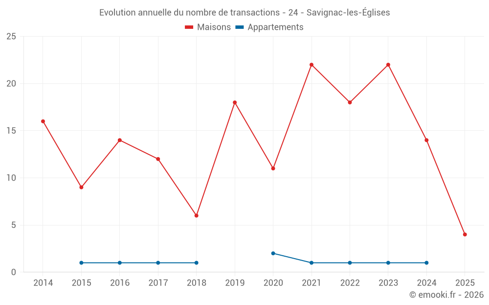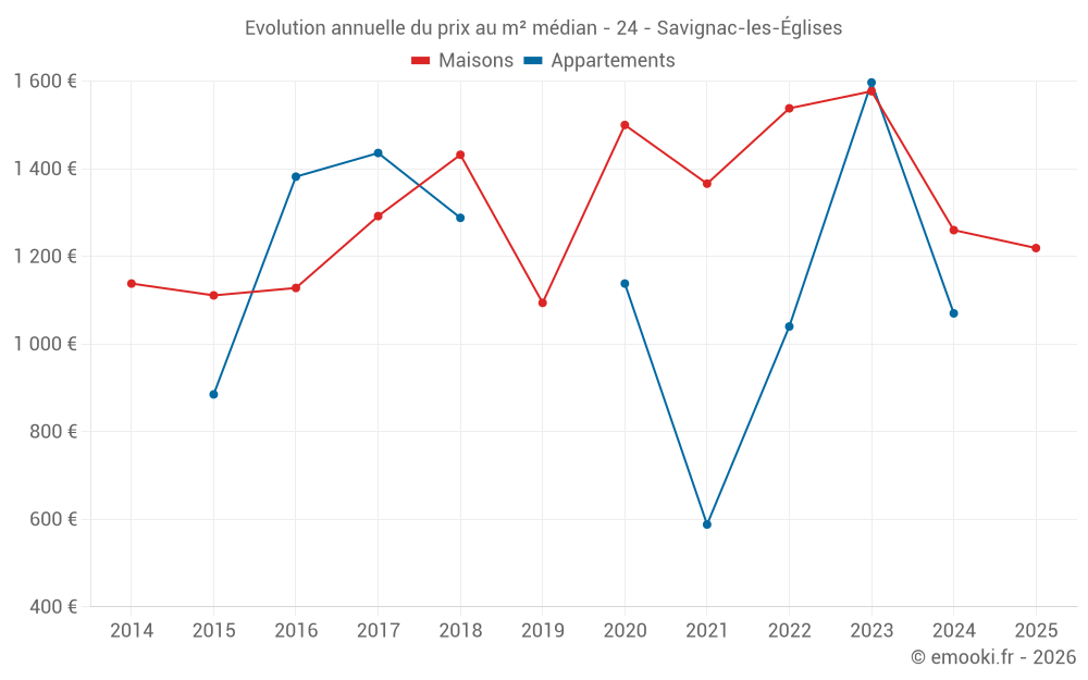 Le prix médian sur les 28 transactions de maisons des 24 derniers mois dans la commune de Savignac-les-Églises était de 1 346 € par mètre carré pour une valeur foncière médiane de 155 000 €. Sur cette période 60% des transactions se sont situées entre 785 et 2 207 € par mètre carré (du 2ème au 8ème déciles).