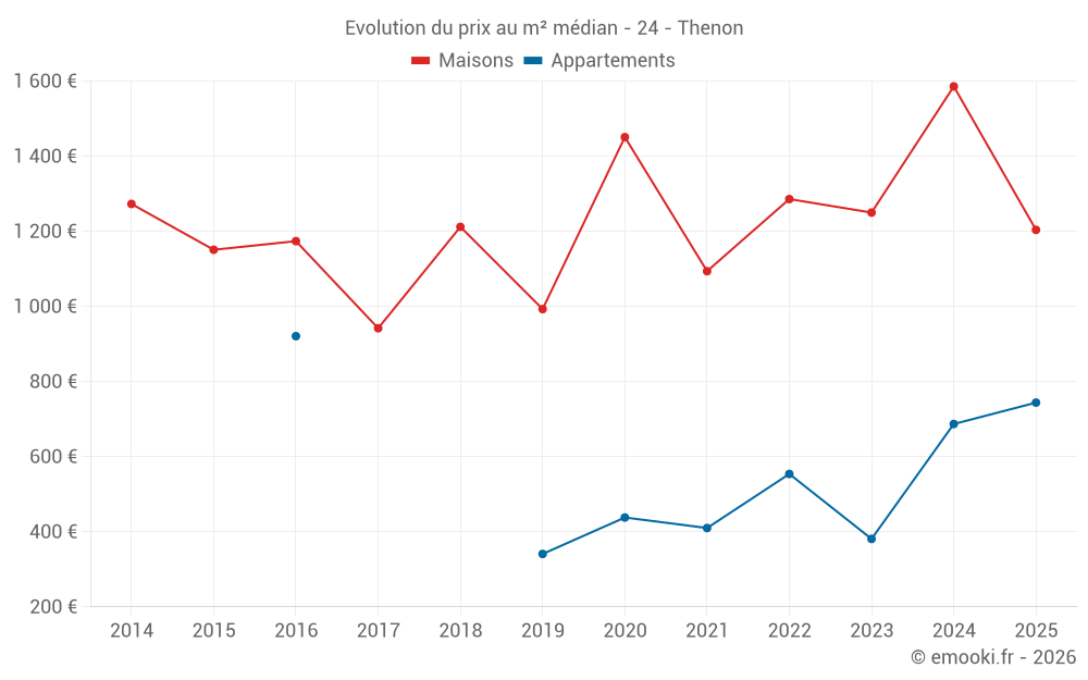 Le prix médian sur les 27 transactions de maisons des 24 derniers mois dans la commune de Thenon était de 1 394 € par mètre carré pour une valeur foncière médiane de 120 000 €. Sur cette période 60% des transactions se sont situées entre 858 et 1 892 € par mètre carré (du 2ème au 8ème déciles).