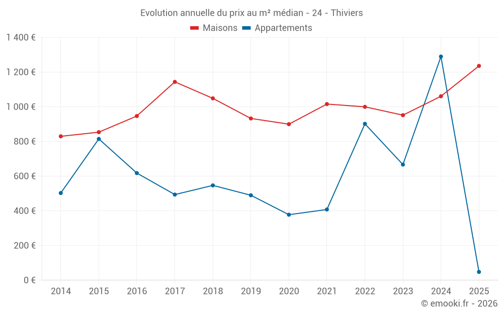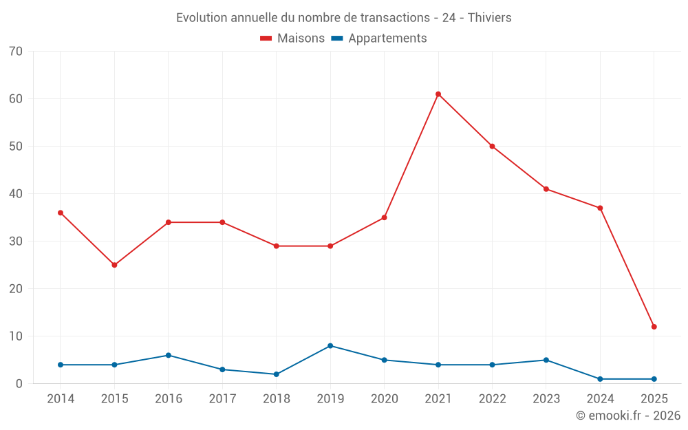 Le prix médian sur les 29 transactions de maisons des 12 derniers mois dans la commune de Thiviers était de 1 111 € par mètre carré pour une valeur foncière médiane de 106 000 €. Sur cette période 60% des transactions se sont situées entre 655 et 1 690 € par mètre carré (du 2ème au 8ème déciles).