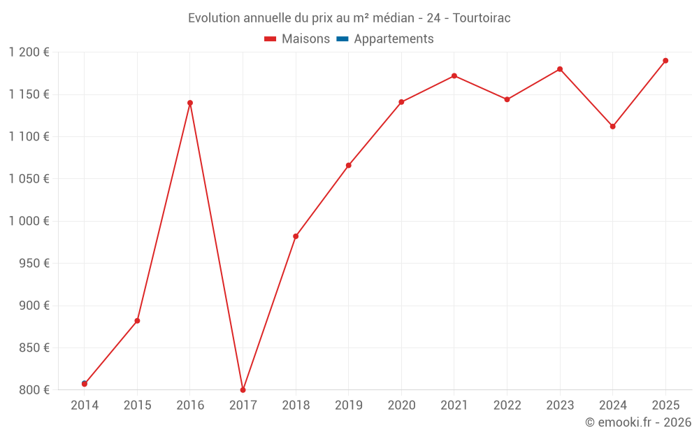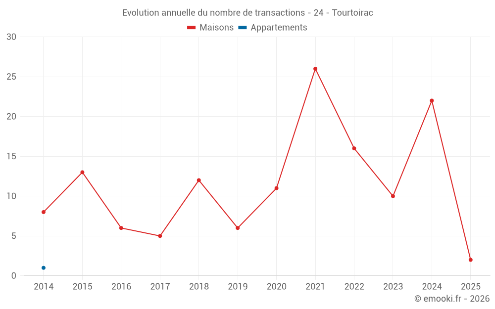 Le prix médian sur les 26 transactions de maisons des 24 derniers mois dans la commune de Tourtoirac était de 1 134 € par mètre carré pour une valeur foncière médiane de 121 000 €. Sur cette période 60% des transactions se sont situées entre 813 et 1 660 € par mètre carré (du 2ème au 8ème déciles).
