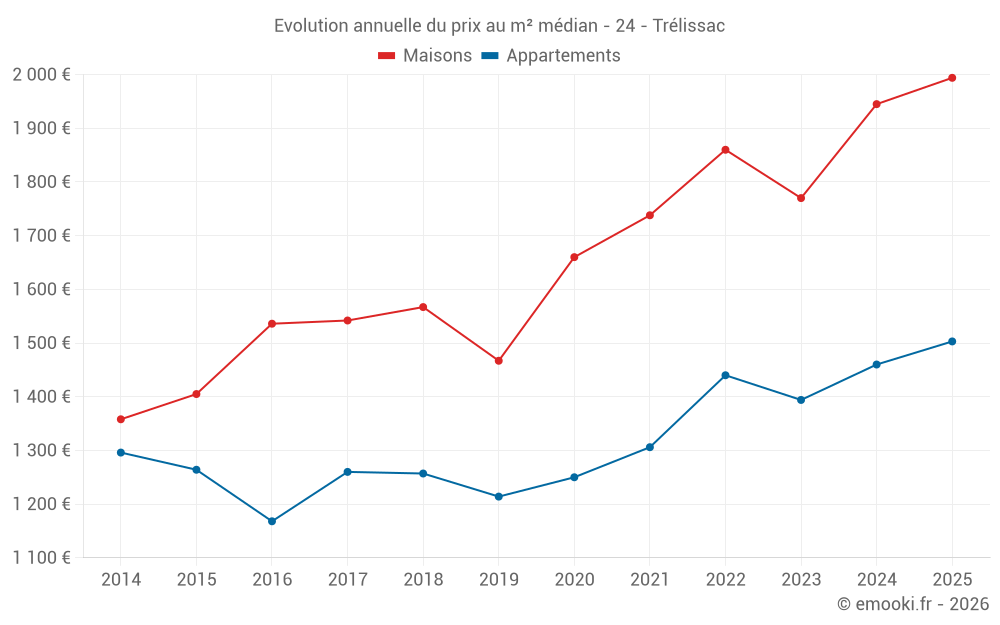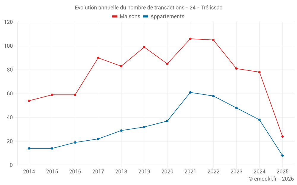 Le prix médian sur les 24 transactions de maisons des 6 derniers mois dans la commune de Trélissac était de 1 994 € par mètre carré pour une valeur foncière médiane de 190 000 €. Sur cette période 60% des transactions se sont situées entre 1 460 et 2 648 € par mètre carré (du 2ème au 8ème déciles).