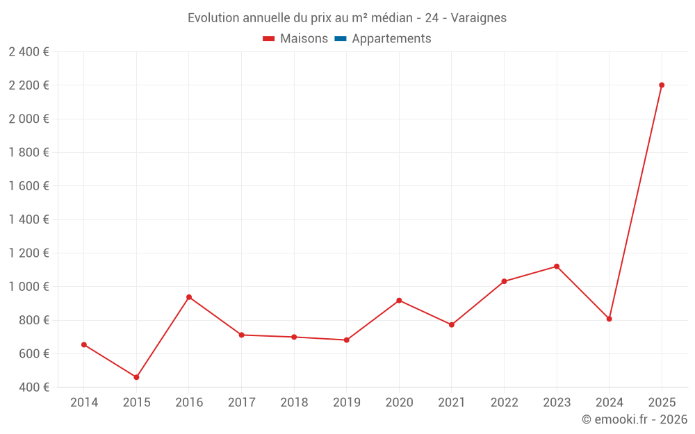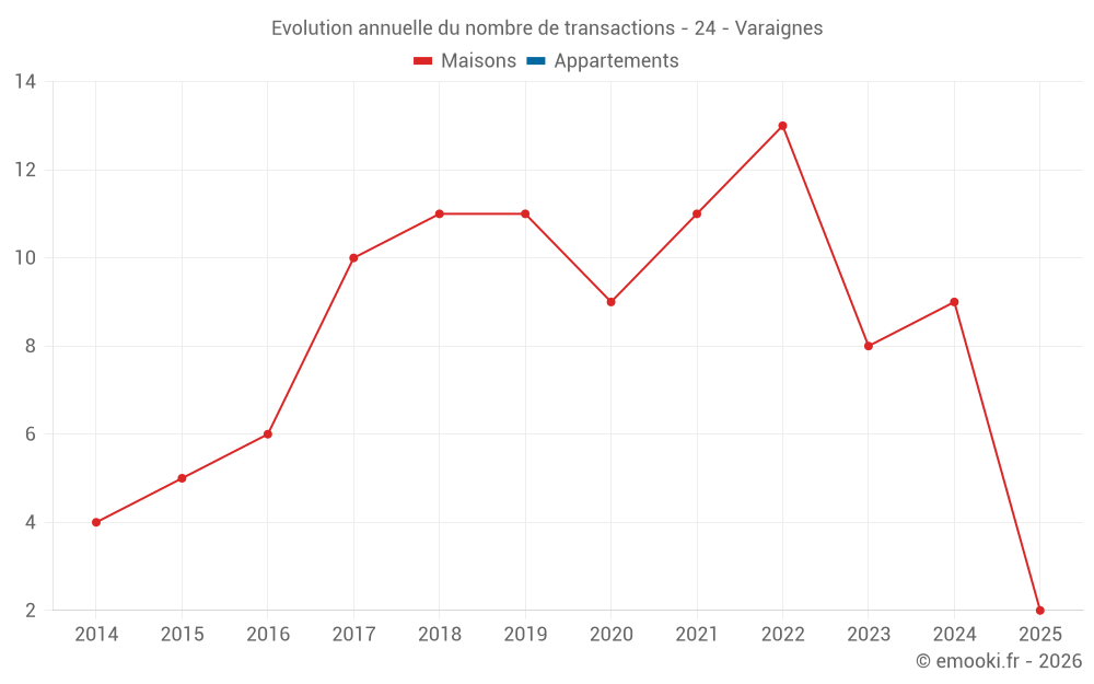 Le prix médian sur les 16 transactions de maisons des 24 derniers mois dans la commune de Varaignes était de 934 € par mètre carré pour une valeur foncière médiane de 90 500 €. Sur cette période 60% des transactions se sont situées entre 700 et 1 931 € par mètre carré (du 2ème au 8ème déciles).