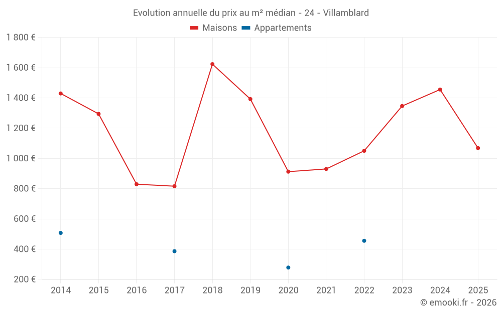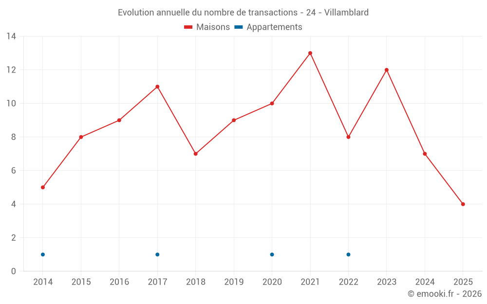Le prix médian sur les 17 transactions de maisons des 24 derniers mois dans la commune de Villamblard était de 1 252 € par mètre carré pour une valeur foncière médiane de 172 500 €. Sur cette période 60% des transactions se sont situées entre 911 et 1 896 € par mètre carré (du 2ème au 8ème déciles).