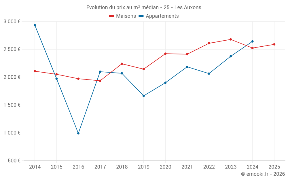 Le prix médian sur les 38 transactions de maisons des 24 derniers mois dans la commune des Auxons était de 2 600 € par mètre carré pour une valeur foncière médiane de 249 150 €. Sur cette période 60% des transactions se sont situées entre 2 072 et 3 007 € par mètre carré (du 2ème au 8ème déciles).