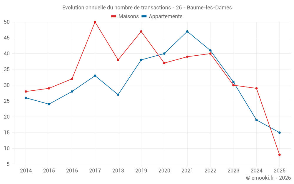 Le prix médian sur les 26 transactions de maisons des 12 derniers mois dans la commune de Baume-les-Dames était de 1 728 € par mètre carré pour une valeur foncière médiane de 152 000 €. Sur cette période 60% des transactions se sont situées entre 1 451 et 2 355 € par mètre carré (du 2ème au 8ème déciles).