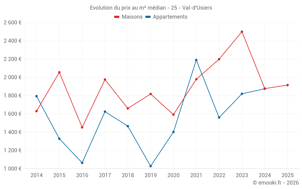 Le prix médian sur les 18 transactions de maisons des 24 derniers mois dans la commune de Val-d'Usiers était de 1 838 € par mètre carré pour une valeur foncière médiane de 260 000 €. Sur cette période 60% des transactions se sont situées entre 1 387 et 3 117 € par mètre carré (du 2ème au 8ème déciles).