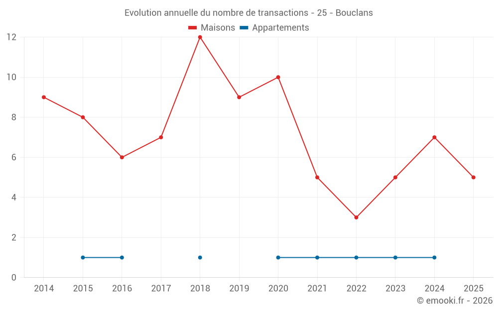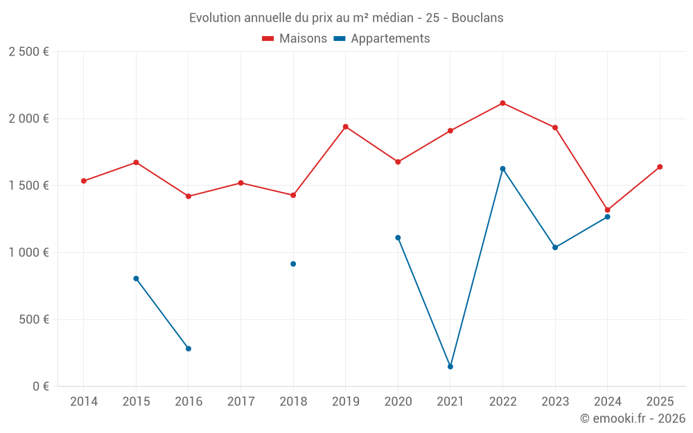 Le prix médian sur les 16 transactions de maisons des 24 derniers mois dans la commune de Bouclans était de 1 602 € par mètre carré pour une valeur foncière médiane de 162 615 €. Sur cette période 60% des transactions se sont situées entre 1 296 et 2 597 € par mètre carré (du 2ème au 8ème déciles).
