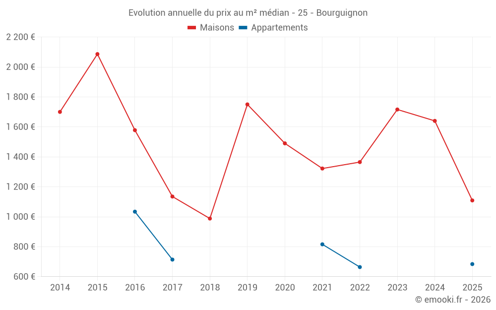 Le prix médian sur les 14 transactions de maisons des 24 derniers mois dans la commune de Bourguignon était de 1 575 € par mètre carré pour une valeur foncière médiane de 150 600 €. Sur cette période 60% des transactions se sont situées entre 1 478 et 1 864 € par mètre carré (du 2ème au 8ème déciles).