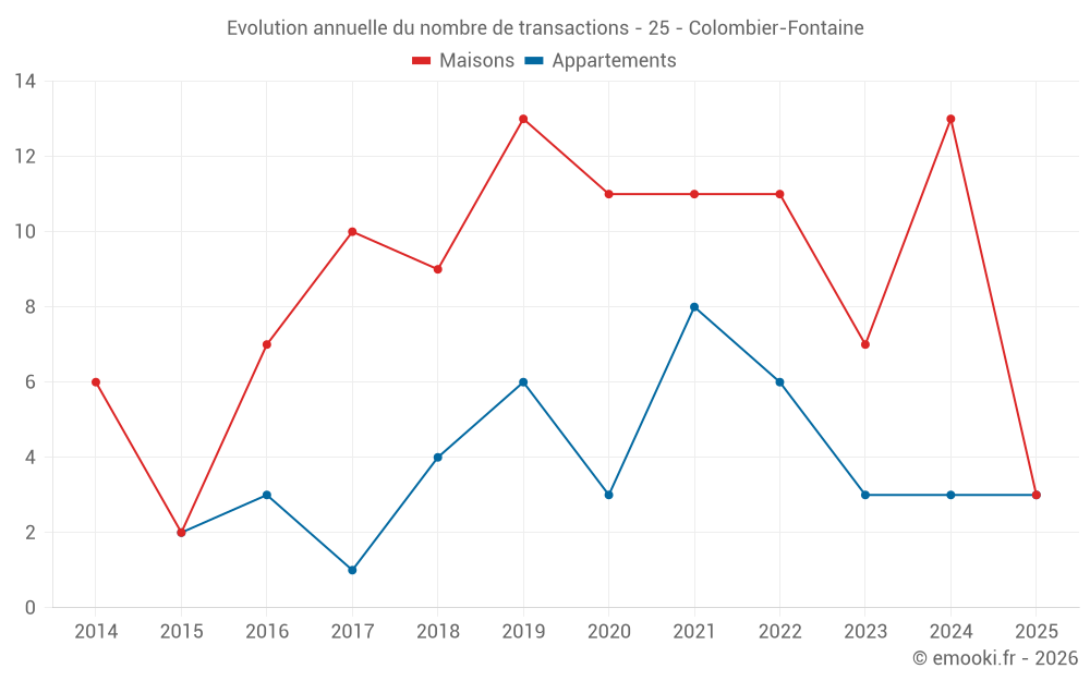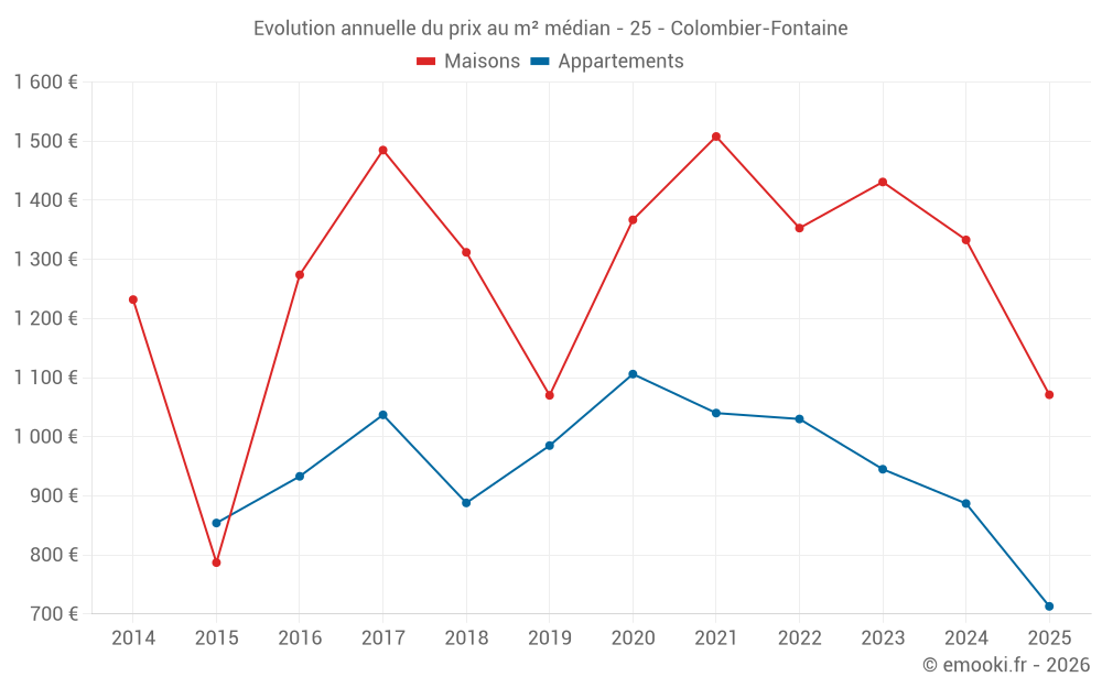 Le prix médian sur les 21 transactions de maisons des 24 derniers mois dans la commune de Colombier-Fontaine était de 1 333 € par mètre carré pour une valeur foncière médiane de 138 000 €. Sur cette période 60% des transactions se sont situées entre 1 038 et 1 667 € par mètre carré (du 2ème au 8ème déciles).