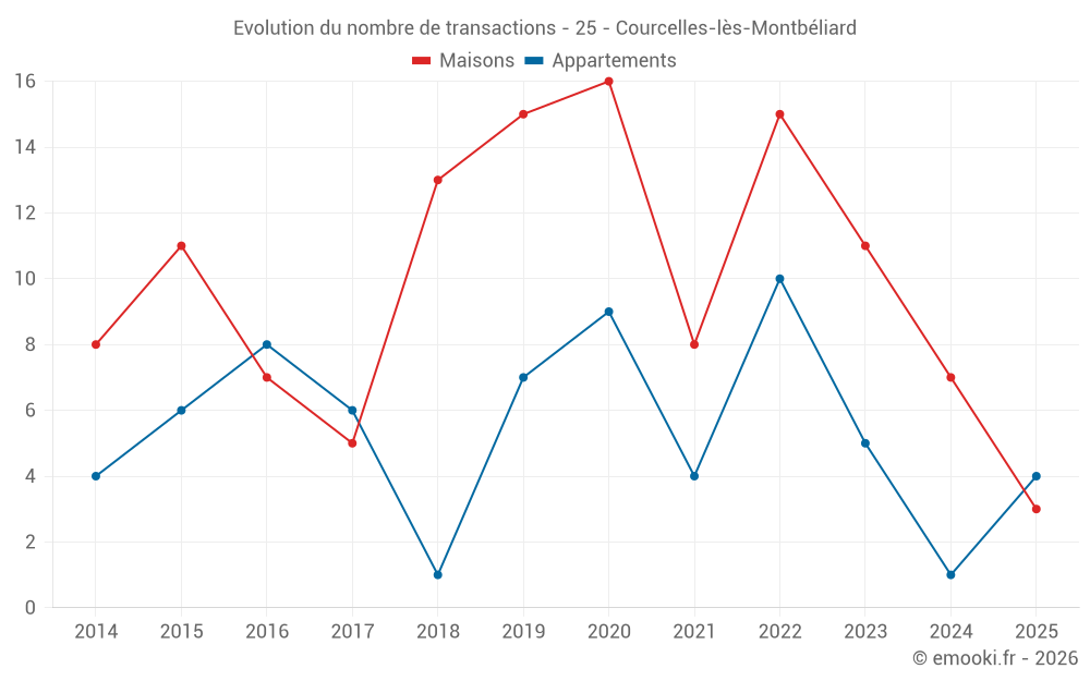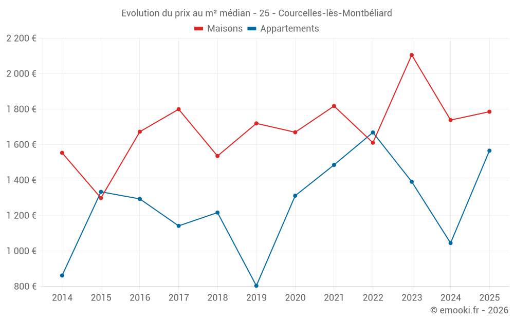 Le prix médian sur les 17 transactions de maisons des 24 derniers mois dans la commune de Courcelles-lès-Montbéliard était de 1 811 € par mètre carré pour une valeur foncière médiane de 200 000 €. Sur cette période 60% des transactions se sont situées entre 1 708 et 2 312 € par mètre carré (du 2ème au 8ème déciles).