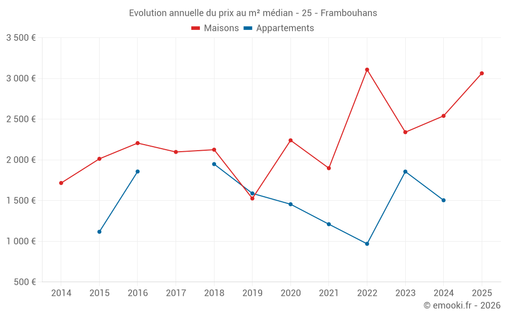 Le prix médian sur les 17 transactions de maisons des 24 derniers mois dans la commune de Frambouhans était de 2 505 € par mètre carré pour une valeur foncière médiane de 257 370 €. Sur cette période 60% des transactions se sont situées entre 1 729 et 2 871 € par mètre carré (du 2ème au 8ème déciles).