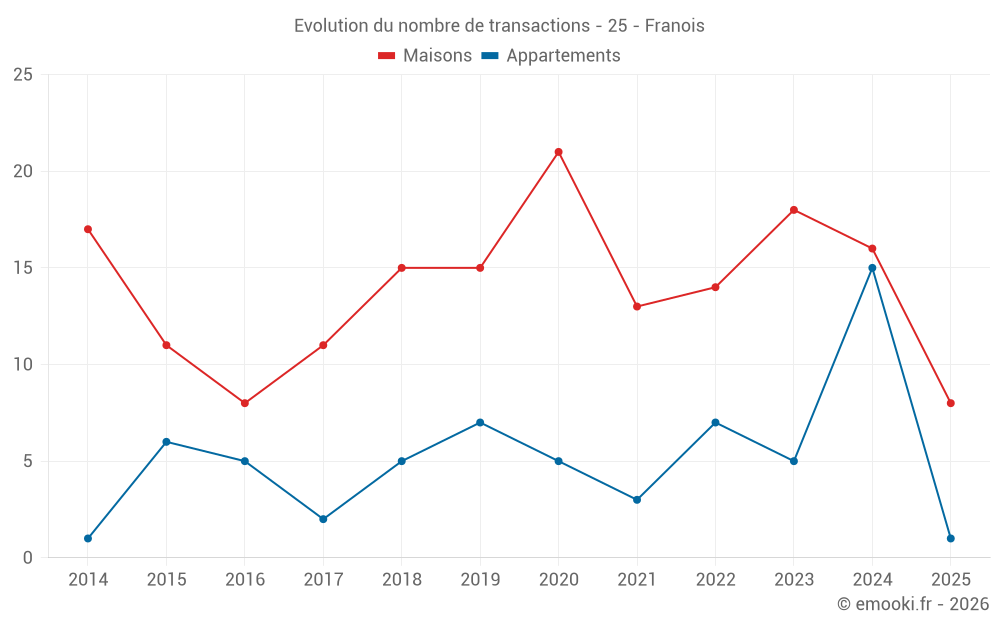 Le prix médian sur les 19 transactions d'appartements des 24 derniers mois dans la commune de Franois était de 1 905 € par mètre carré pour une valeur foncière médiane de 150 000 €. Sur cette période 60% des transactions se sont situées entre 1 602 et 2 709 € par mètre carré (du 2ème au 8ème déciles).