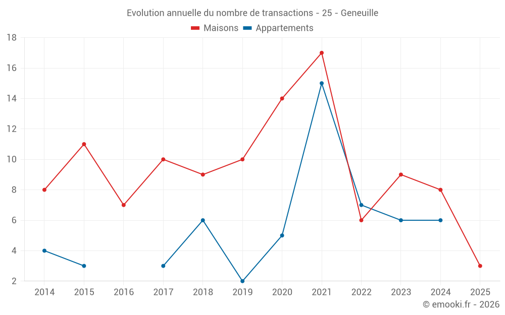 Le prix médian sur les 15 transactions de maisons des 24 derniers mois dans la commune de Geneuille était de 1 972 € par mètre carré pour une valeur foncière médiane de 334 000 €. Sur cette période 60% des transactions se sont situées entre 1 124 et 3 125 € par mètre carré (du 2ème au 8ème déciles).