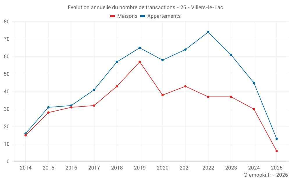 Le prix médian sur les 41 transactions d'appartements des 12 derniers mois dans la commune de Villers-le-Lac était de 2 607 € par mètre carré pour une valeur foncière médiane de 158 700 €. Sur cette période 60% des transactions se sont situées entre 1 857 et 3 532 € par mètre carré (du 2ème au 8ème déciles).
