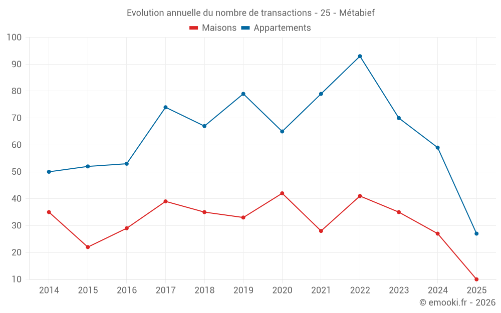 Le prix médian sur les 27 transactions d'appartements des 6 derniers mois dans la commune de Métabief était de 3 523 € par mètre carré pour une valeur foncière médiane de 120 000 €. Sur cette période 60% des transactions se sont situées entre 2 761 et 4 323 € par mètre carré (du 2ème au 8ème déciles).