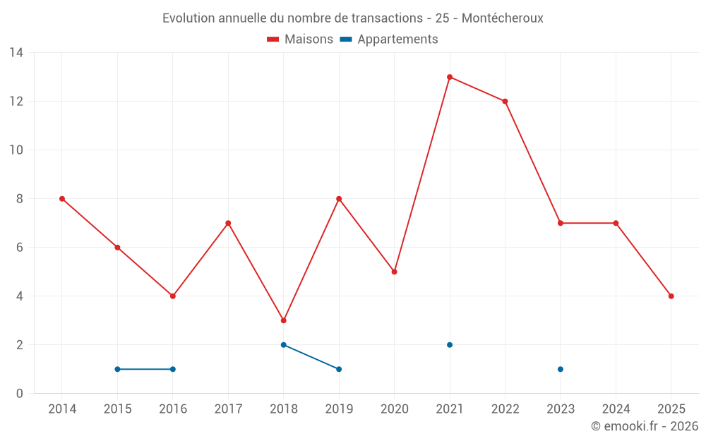 Le prix médian sur les 15 transactions de maisons des 24 derniers mois dans la commune de Montécheroux était de 1 131 € par mètre carré pour une valeur foncière médiane de 82 500 €. Sur cette période 60% des transactions se sont situées entre 622 et 1 714 € par mètre carré (du 2ème au 8ème déciles).