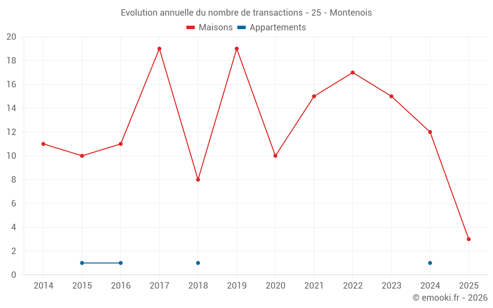 Le prix médian sur les 24 transactions de maisons des 24 derniers mois dans la commune de Montenois était de 1 478 € par mètre carré pour une valeur foncière médiane de 139 000 €. Sur cette période 60% des transactions se sont situées entre 1 028 et 2 261 € par mètre carré (du 2ème au 8ème déciles).