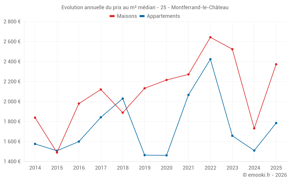 Le prix médian sur les 26 transactions de maisons des 24 derniers mois dans la commune de Montferrand-le-Château était de 2 306 € par mètre carré pour une valeur foncière médiane de 222 675 €. Sur cette période 60% des transactions se sont situées entre 1 575 et 2 668 € par mètre carré (du 2ème au 8ème déciles).
