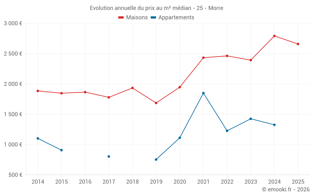 Le prix médian sur les 15 transactions de maisons des 24 derniers mois dans la commune de Morre était de 2 462 € par mètre carré pour une valeur foncière médiane de 238 800 €. Sur cette période 60% des transactions se sont situées entre 2 231 et 2 920 € par mètre carré (du 2ème au 8ème déciles).