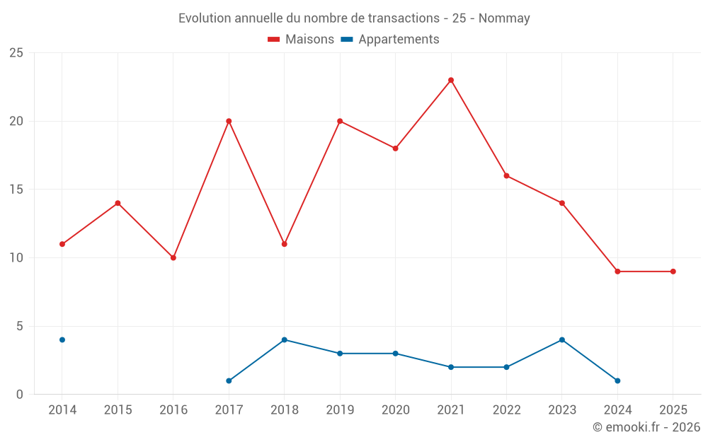 Le prix médian sur les 25 transactions de maisons des 24 derniers mois dans la commune de Nommay était de 1 800 € par mètre carré pour une valeur foncière médiane de 180 000 €. Sur cette période 60% des transactions se sont situées entre 1 414 et 2 241 € par mètre carré (du 2ème au 8ème déciles).