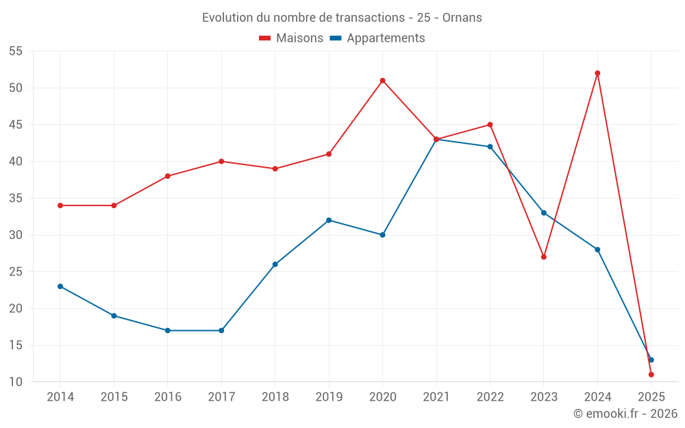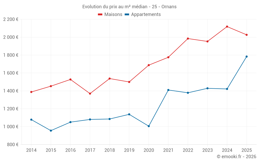 Le prix médian sur les 45 transactions de maisons des 12 derniers mois dans la commune d'Ornans était de 2 000 € par mètre carré pour une valeur foncière médiane de 188 500 €. Sur cette période 60% des transactions se sont situées entre 1 705 et 2 340 € par mètre carré (du 2ème au 8ème déciles).