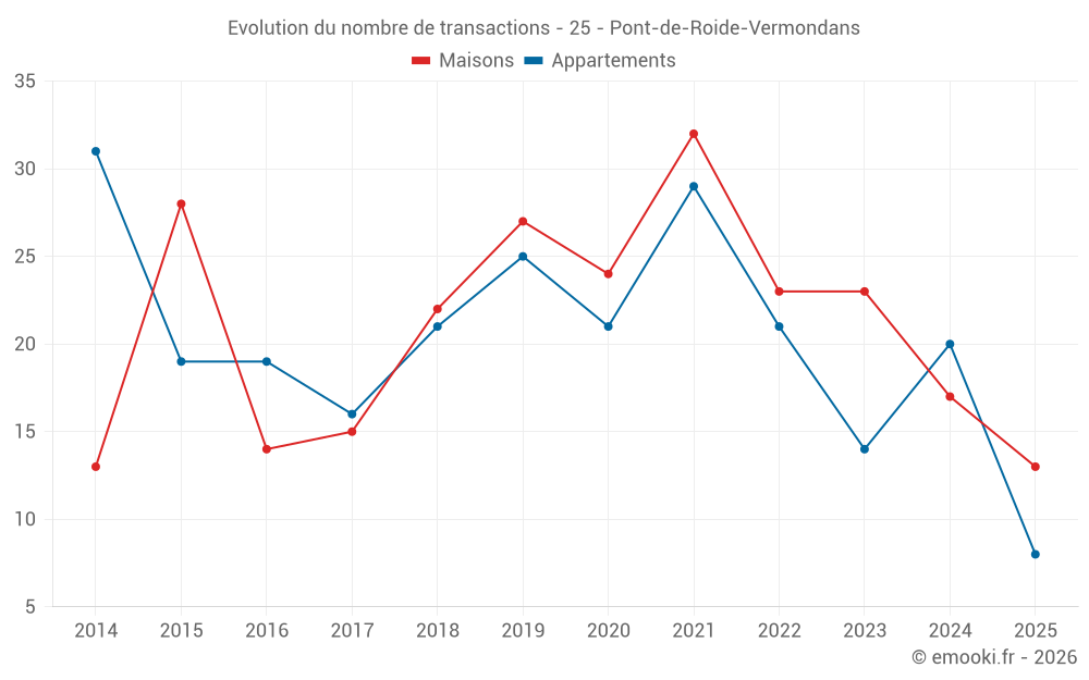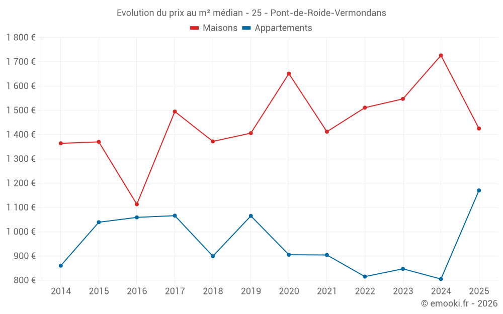 Le prix médian sur les 24 transactions de maisons des 12 derniers mois dans la commune de Pont-de-Roide-Vermondans était de 1 452 € par mètre carré pour une valeur foncière médiane de 148 925 €. Sur cette période 60% des transactions se sont situées entre 1 031 et 1 859 € par mètre carré (du 2ème au 8ème déciles).
