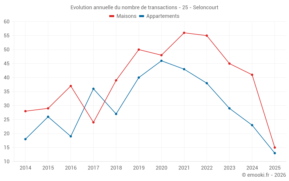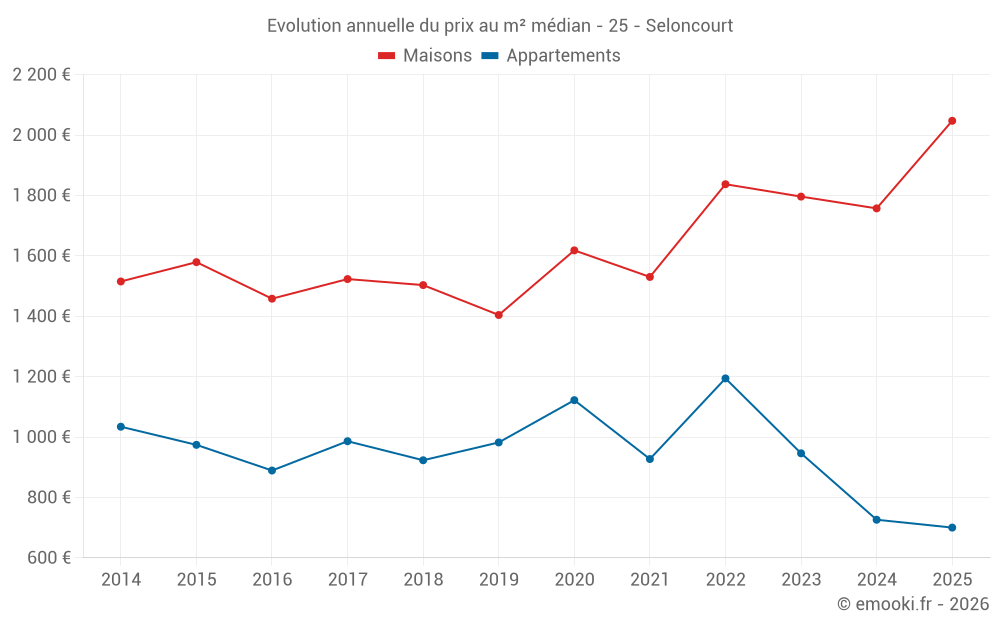 Le prix médian sur les 30 transactions de maisons des 12 derniers mois dans la commune de Seloncourt était de 1 778 € par mètre carré pour une valeur foncière médiane de 165 548 €. Sur cette période 60% des transactions se sont situées entre 1 014 et 2 410 € par mètre carré (du 2ème au 8ème déciles).