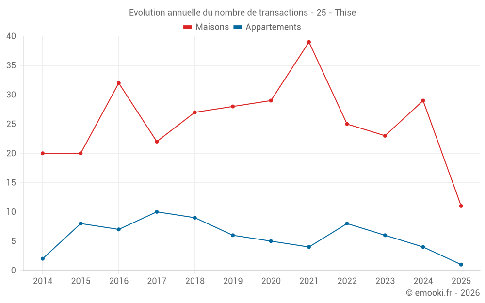 Le prix médian sur les 29 transactions de maisons des 12 derniers mois dans la commune de Thise était de 2 272 € par mètre carré pour une valeur foncière médiane de 230 000 €. Sur cette période 60% des transactions se sont situées entre 1 922 et 2 625 € par mètre carré (du 2ème au 8ème déciles).