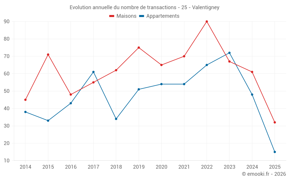 Le prix médian sur les 32 transactions de maisons des 6 derniers mois dans la commune de Valentigney était de 1 140 € par mètre carré pour une valeur foncière médiane de 123 000 €. Sur cette période 60% des transactions se sont situées entre 797 et 1 736 € par mètre carré (du 2ème au 8ème déciles).