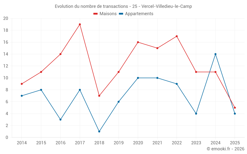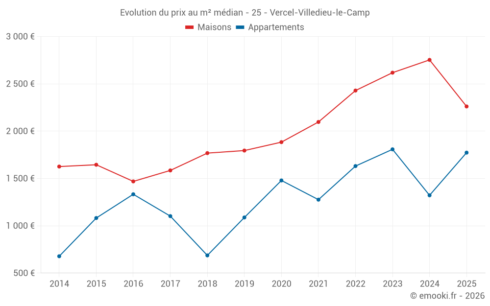 Le prix médian sur les 19 transactions de maisons des 24 derniers mois dans la commune de Vercel-Villedieu-le-Camp était de 2 650 € par mètre carré pour une valeur foncière médiane de 279 500 €. Sur cette période 60% des transactions se sont situées entre 2 031 et 3 120 € par mètre carré (du 2ème au 8ème déciles).