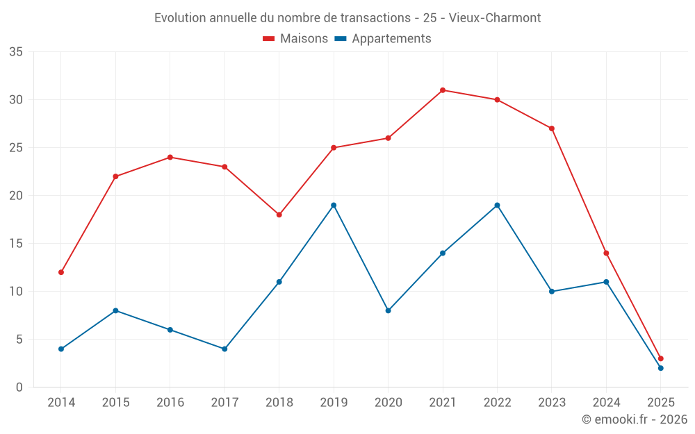 Le prix médian sur les 28 transactions de maisons des 24 derniers mois dans la commune de Vieux-Charmont était de 1 690 € par mètre carré pour une valeur foncière médiane de 136 895 €. Sur cette période 60% des transactions se sont situées entre 1 356 et 2 196 € par mètre carré (du 2ème au 8ème déciles).