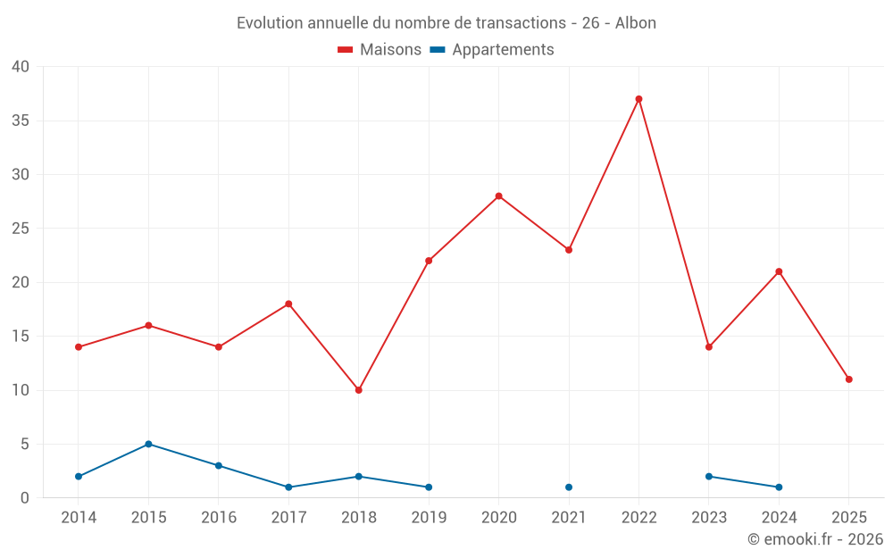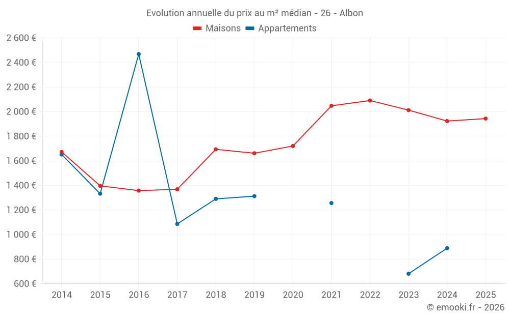 Le prix médian sur les 25 transactions de maisons des 12 derniers mois dans la commune d'Albon était de 1 989 € par mètre carré pour une valeur foncière médiane de 207 000 €. Sur cette période 60% des transactions se sont situées entre 1 282 et 2 429 € par mètre carré (du 2ème au 8ème déciles).