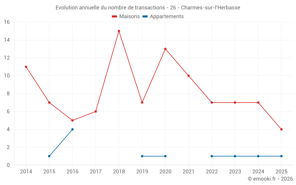 Le prix médian sur les 16 transactions de maisons des 24 derniers mois dans la commune de Charmes-sur-l'Herbasse était de 2 430 € par mètre carré pour une valeur foncière médiane de 237 306 €. Sur cette période 60% des transactions se sont situées entre 2 157 et 2 915 € par mètre carré (du 2ème au 8ème déciles).