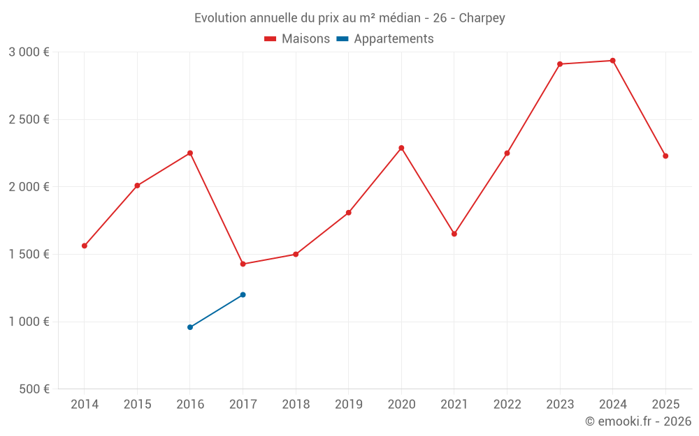 Le prix médian sur les 21 transactions de maisons des 24 derniers mois dans la commune de Charpey était de 2 929 € par mètre carré pour une valeur foncière médiane de 324 300 €. Sur cette période 60% des transactions se sont situées entre 2 545 et 3 426 € par mètre carré (du 2ème au 8ème déciles).