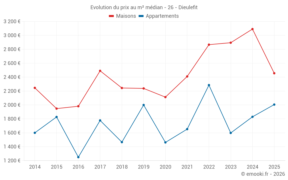 Le prix médian sur les 19 transactions de maisons des 6 derniers mois dans la commune de Dieulefit était de 2 456 € par mètre carré pour une valeur foncière médiane de 270 000 €. Sur cette période 60% des transactions se sont situées entre 2 015 et 3 226 € par mètre carré (du 2ème au 8ème déciles).