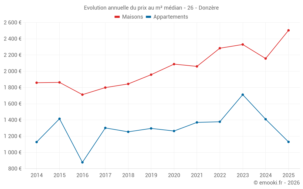 Le prix médian sur les 38 transactions de maisons des 12 derniers mois dans la commune de Donzère était de 2 472 € par mètre carré pour une valeur foncière médiane de 219 940 €. Sur cette période 60% des transactions se sont situées entre 1 787 et 2 802 € par mètre carré (du 2ème au 8ème déciles).